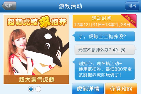 看到是不是很心动呢?不仅有chinajoy限量版大虎鲸,还有呆萌可爱的小虎鲸宝宝等你抱养!新版上线后,虎鲸活动将全面开启,活动期间玩《波克斗地主》有海量虎鲸抵用券相送,赚元宝还送虎鲸券,人人都有机会把虎鲸抱回家!