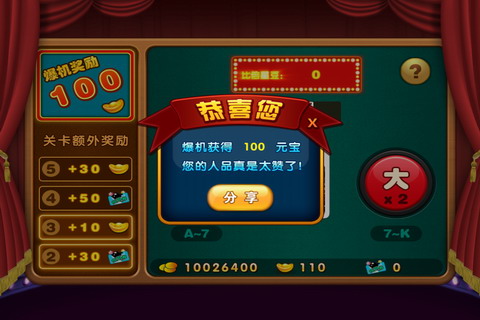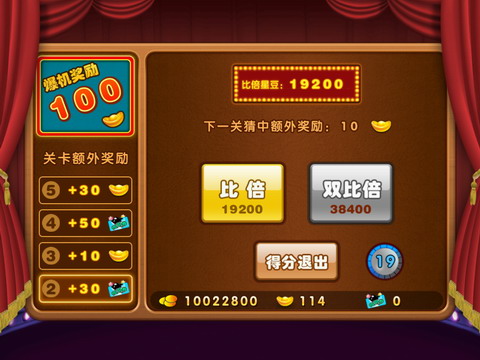 《波克斗地主》本次更新更是将闯关小游戏升级为幸运猜牌,不同于以往的翻牌模式,为了给玩家带来更刺激的闯关经历,《波克斗地主》推出猜牌比倍模式,玩法更刺激,奖励更丰富,只要你4倍赢得游戏,就可以来到这里比倍,只要你足够幸运,爆机奖励星豆元宝让你拿到手软!不过小编提醒玩家一句,猜牌共有5关,如果对自己运气不是很自信的话,那见好就收噢,贪心的话可是什么都拿不到喔~